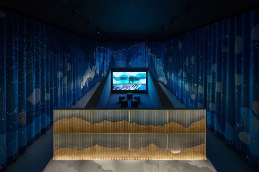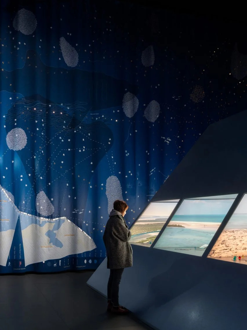 在這個(gè)空間的中間是一個(gè)分為三個(gè)水平條帶的電影院屏幕,顯示了一部關(guān)于卡塔爾歷史的AMO-directed電影,其中包括考古遺址、自然保護(hù)區(qū)、生態(tài)棲息地和沿海城市的鏡頭。