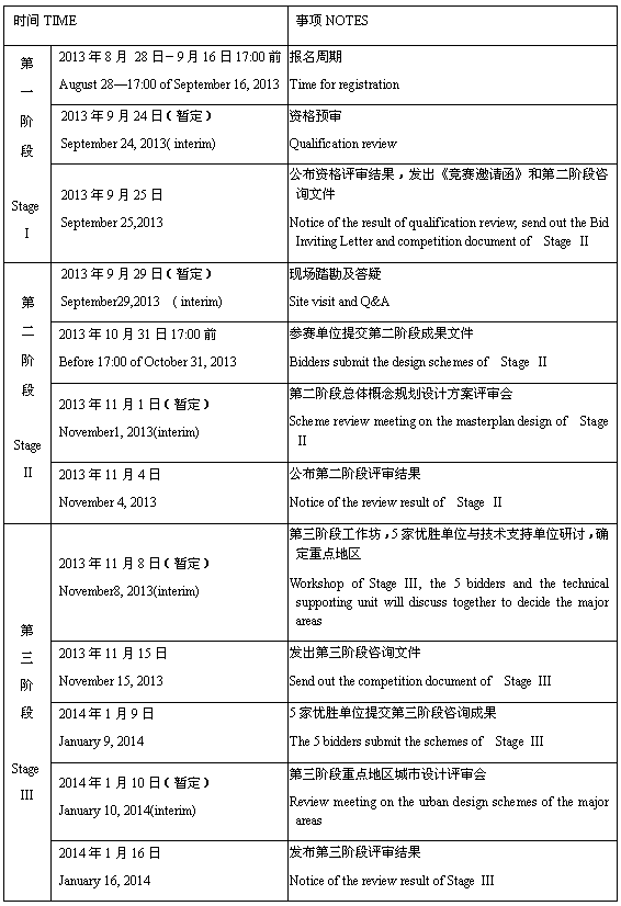 3.3 第二階段-總體概念規(guī)劃設(shè)計(jì)階段,8家入圍單位按要求提交本項(xiàng)目的總體概念規(guī)劃及進(jìn)行詳細(xì)城市設(shè)計(jì)的重點(diǎn)地區(qū)劃分說明,由評(píng)審委員會(huì)經(jīng)過排序評(píng)選出前5家優(yōu)勝單位進(jìn)入第三階段競(jìng)賽;