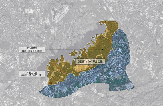 本次規(guī)劃范圍由核心區(qū)和擴(kuò)展區(qū)兩部分構(gòu)成,總面積約為20.7平方公里。其中,松山湖南部濱湖地區(qū)(為核心區(qū)),北、西至松木山水庫岸線、南至松山湖園區(qū)界線、東至莞深高速,面積約為8.9平方公里;大朗象山片區(qū)(為擴(kuò)展區(qū)),環(huán)湖路、虎崗高速、莞深高速圍合的區(qū)域,面積為11.8平方公里。