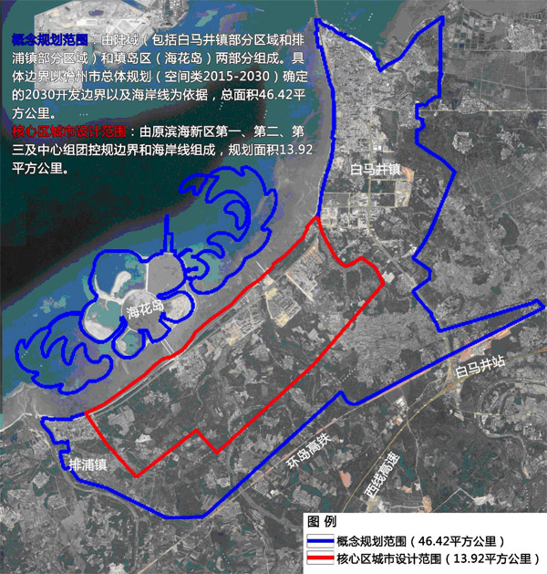 The scope of core urban design is defined by the boundaries and coastlines regulated by the first, second, third and central groups boundary of regulatory planning and coastline of the original Binhai New District, and the planning area is 13.92 square kilometers.