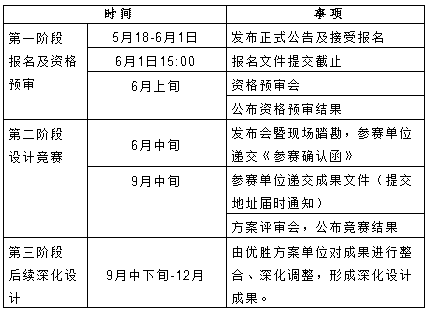 本次競(jìng)賽工作分為三個(gè)階段進(jìn)行:第一階段為公開報(bào)名及資格預(yù)審;第二階段為設(shè)計(jì)競(jìng)賽,第三階段為后續(xù)深化設(shè)計(jì)。