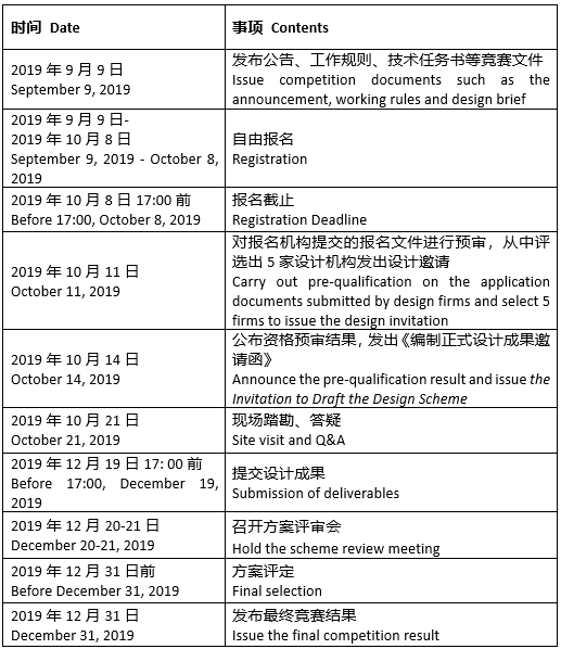 There will be three stages, namely, "the Stage of Pre-qualification", "the Stage of Design Competition" and "the Stage of Integration and Deepening of Deliverables" in this International Competition. At the stage of pre-qualification, five (5) design firms will be selected to issue the Invitation to Draft the Design Scheme according to the application documents (including commercial documents and project technical ideas) submitted by applicants (at the same time, two [2] alternatives will be selected; in case any invited firm quits, they can take its place in order). At the stage of design competition, five (5) invited firms will submit their deliverables, and after the experts’ review and final selection, the top three will be selected and ranked accordingly. At the stage of integration and deepening of deliverables, the first-prize winner shall integrate and optimize these deliverables at the competition stage into a formal design scheme (excluding the design development and construction design but can offer guidance for the next-stage design) according to the experts’ review comments and the Organizer’s requirements, and organize two [2] workshops as well. The design firms who ranked second and third shall arrange the key designers to attend these two [2] workshops organized by the first-prize winner.