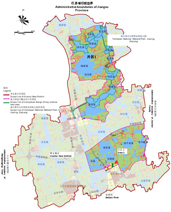 Xiushui New District is located in the core area of the Yangtze River Delta, 100 kilometers from Shanghai and Hangzhou, covering Wangjiangjing Town and Youchegang Town in the northern part of Xiuzhou District, Jiaxing City, Zhejiang Province. It is the demonstration zone and coordination zone of the Yangtze River Delta, which belongs to the Taihu Lake Basin water system, with dense river network and numerous lakes. Xiushui New District is the administrative district of Wangjiangjing Town and Youchegang Town, with a total area of about 190 square kilometers. The key shallow lake area is divided into two parts at north and south, with a total area of about 56 square kilometers.