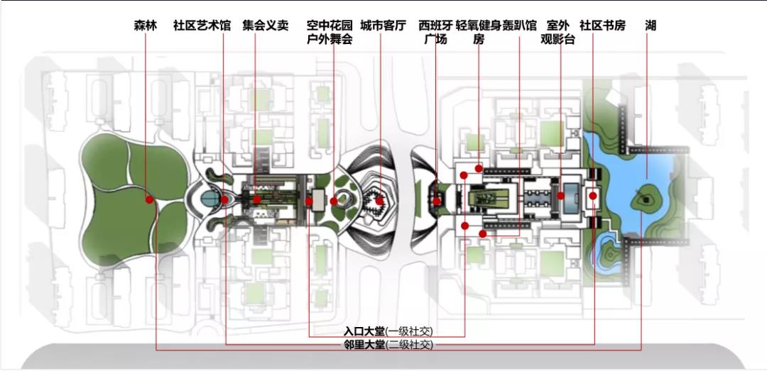 中軸廣場設(shè)計(jì)有劇場、禮堂、書房、階梯講堂、游泳館等,商業(yè)配套有咖啡店、主力店、兒童游樂、兒童社交、浪漫愛情主題基地等。