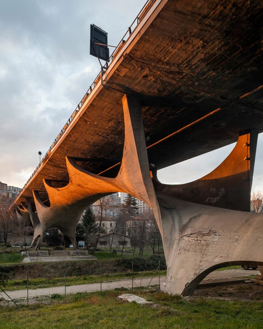 攝影師斯特凡諾-佩雷戈(Stefano Perego)說:“塞爾吉奧-穆斯梅奇最著名的杰作是一座利用重力的橋梁,它沒有使用真正的柱子或柱子,而是用一道混凝土波浪創(chuàng)造出幾個拱門,優(yōu)雅而高效地支撐著高架道路!