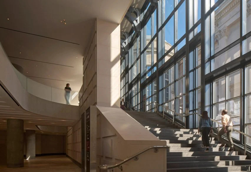 玻璃立面沿著樓梯延伸,原來(lái)的深色玻璃平面被透明玻璃所取代,以自然光照亮雙層高的門(mén)廳,并欣賞相鄰的威爾金斯大樓和特拉法加廣場(chǎng)的景色。