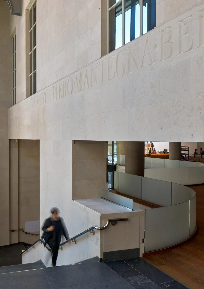 該建筑現(xiàn)有的樓梯從門(mén)廳通往夾層上的書(shū)店、酒吧和餐廳,以及頂層的原始畫(huà)廊空間。