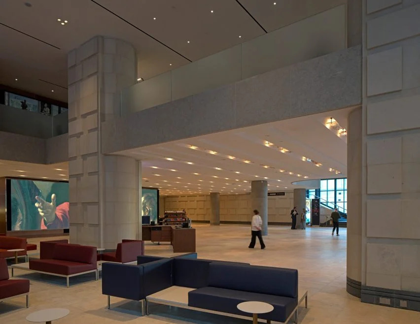 在地下一層,塞爾多夫工作室通過(guò)更換地毯、座椅內(nèi)飾和燈光來(lái)更新劇院。這層樓的公共廁所被搬到了其他地方,以增加劇院等候區(qū)的面積。