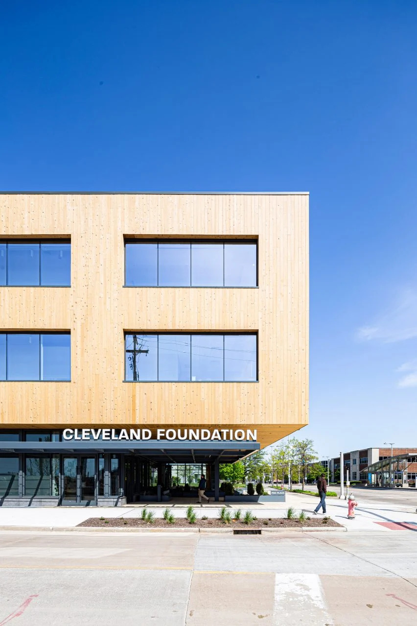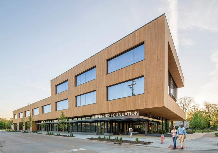 美國S9工作室(S9 Architecture)為克利夫蘭基金會(huì)(The Cleveland Foundation)完成了一座建筑,其特點(diǎn)是溫暖的雪松覆層、大窗戶和由大塊木材制成的柱梁結(jié)構(gòu)系統(tǒng)。