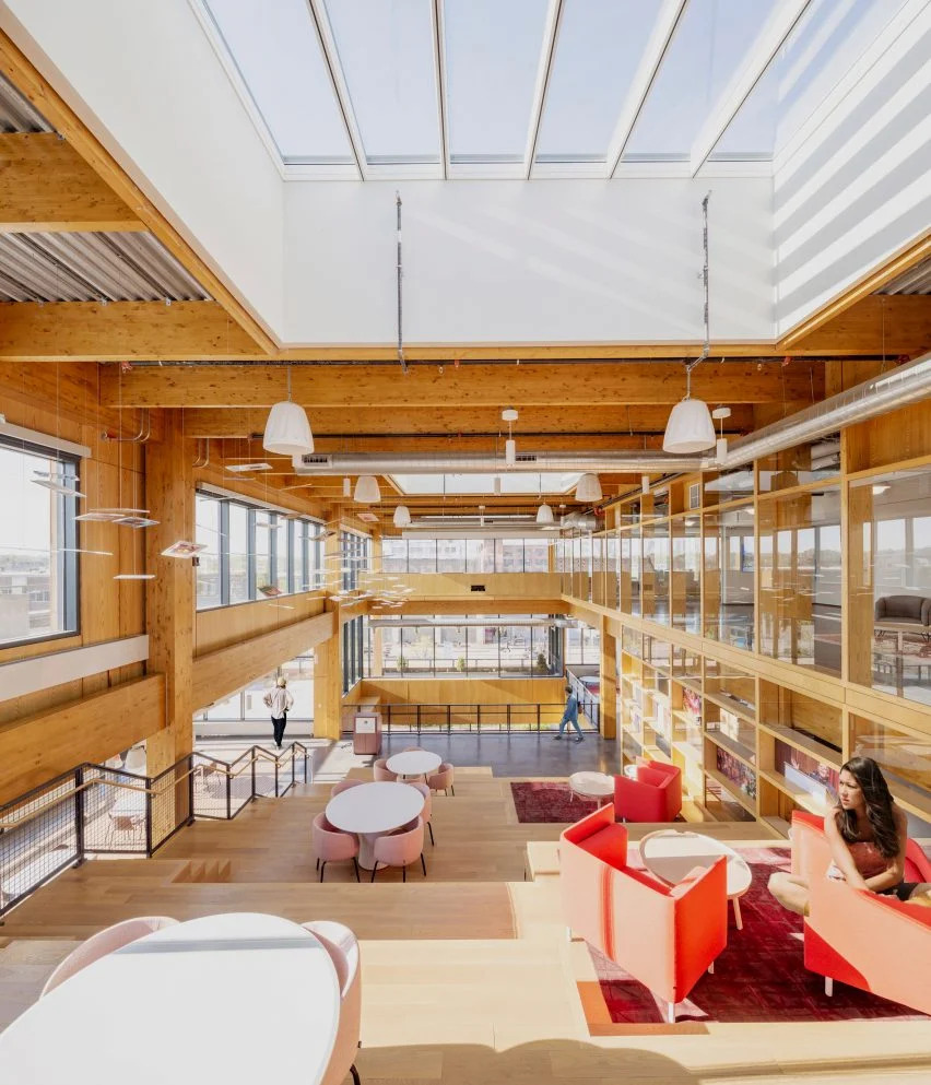 建筑的中心是一個(gè)木制的“社區(qū)樓梯”,人們可以在那里閑逛和交流。頭頂上,一個(gè)巨大的天窗引入了自然光。
